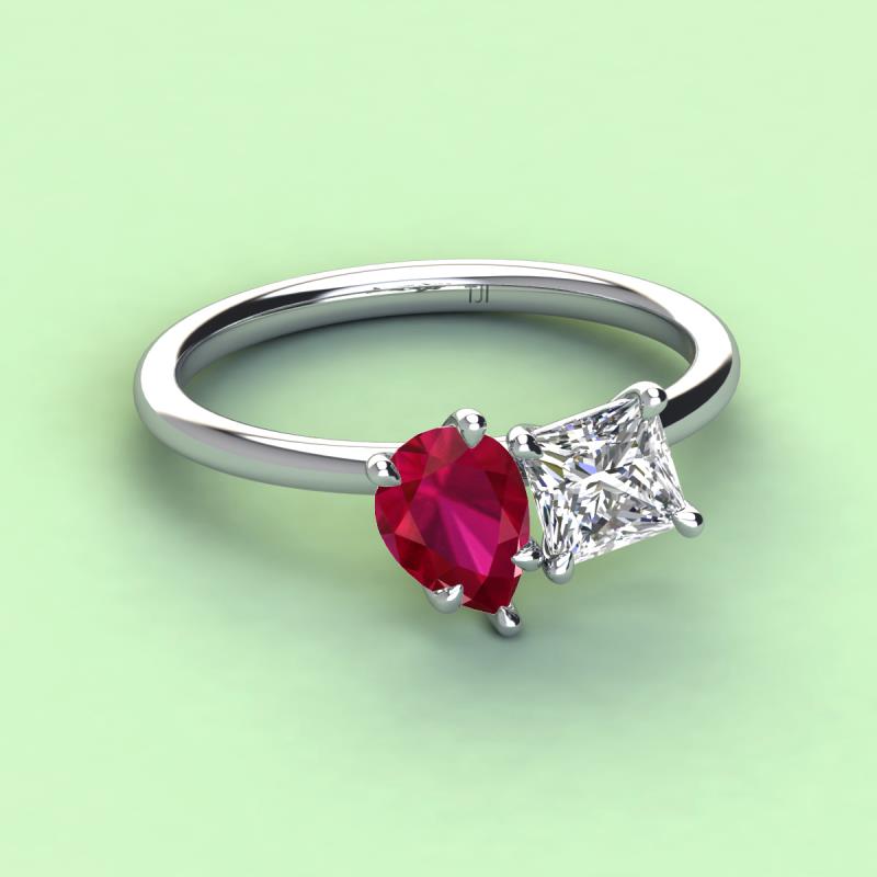 A beautiful symbol of everlasting love, this duo two-stone ring showcases a pair of Pear Shape Ruby shimmering alongside of a luminous Princess Shape IGI Certified Lab Grown Diamond crafted beautifully that represents two of you together.
