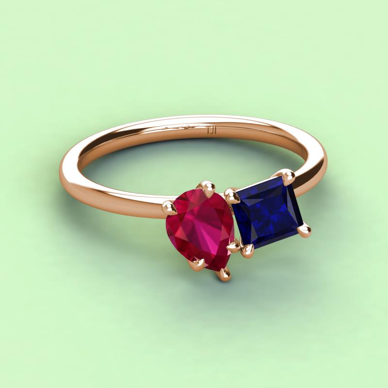 A beautiful symbol of everlasting love, this duo two-stone ring showcases a pair of Pear Shape Ruby shimmering alongside of a luminous Princess Shape Lab Created Blue Sapphire crafted beautifully that represents two of you together.