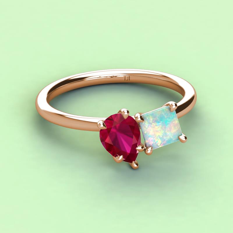 A beautiful symbol of everlasting love, this duo two-stone ring showcases a pair of Pear Shape Ruby shimmering alongside of a luminous Princess Shape Lab Created Opal crafted beautifully that represents two of you together.