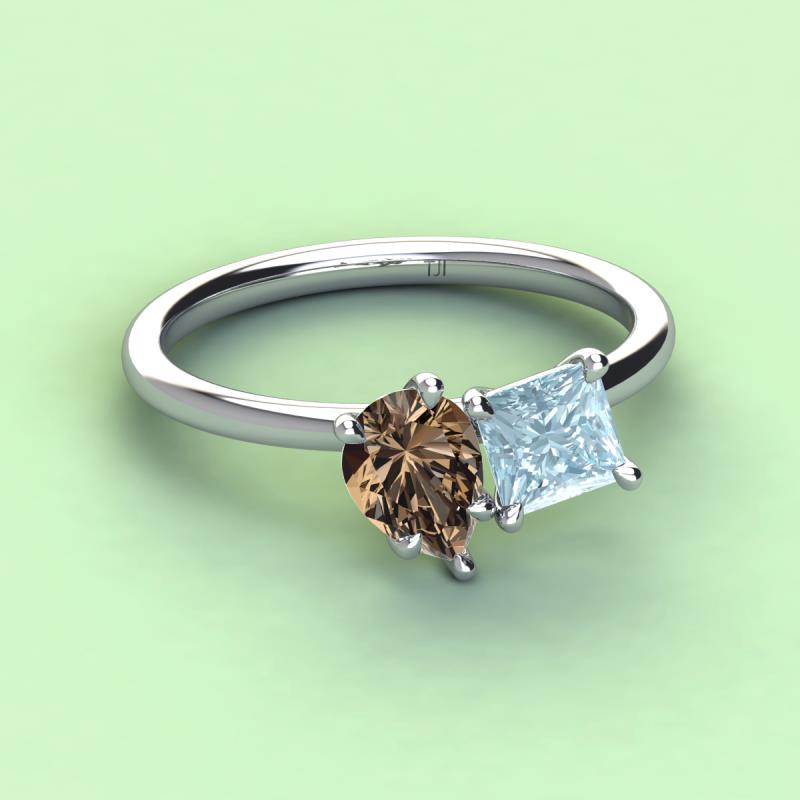 A beautiful symbol of everlasting love, this duo two-stone ring showcases a pair of Pear Shape Smoky Quartz shimmering alongside of a luminous Princess Shape Aquamarine crafted beautifully that represents two of you together.