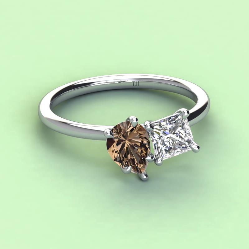 A beautiful symbol of everlasting love, this duo two-stone ring showcases a pair of Pear Shape Smoky Quartz shimmering alongside of a luminous Princess Shape IGI Certified Lab Grown Diamond crafted beautifully that represents two of you together.