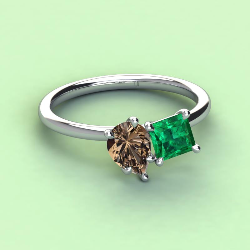 A beautiful symbol of everlasting love, this duo two-stone ring showcases a pair of Pear Shape Smoky Quartz shimmering alongside of a luminous Princess Shape Lab Created Emerald crafted beautifully that represents two of you together.