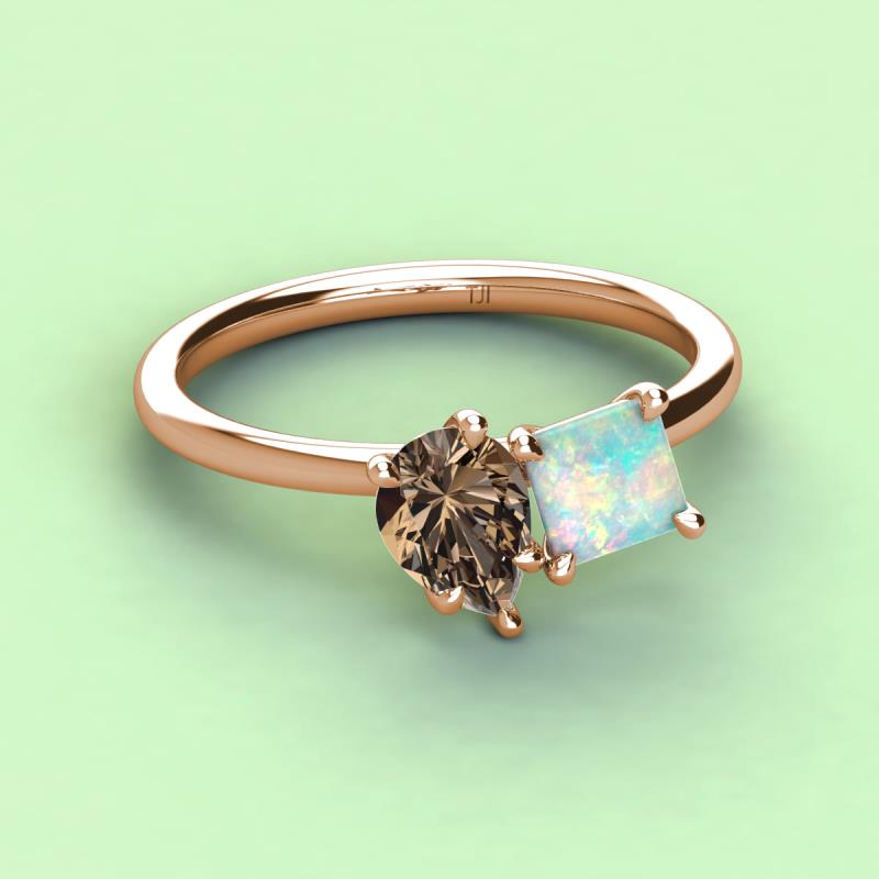 A beautiful symbol of everlasting love, this duo two-stone ring showcases a pair of Pear Shape Smoky Quartz shimmering alongside of a luminous Princess Shape Lab Created Opal crafted beautifully that represents two of you together.