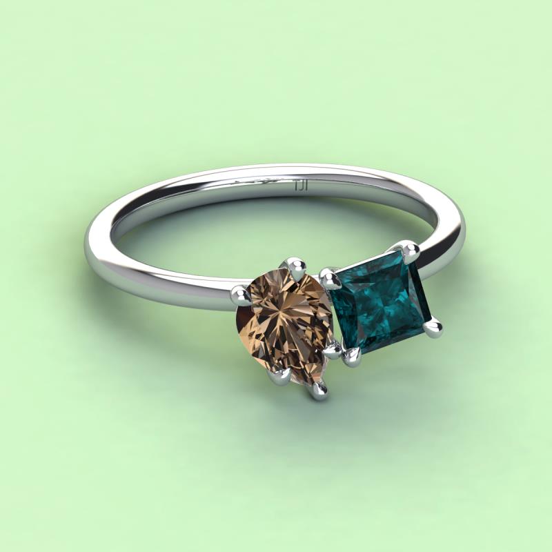 A beautiful symbol of everlasting love, this duo two-stone ring showcases a pair of Pear Shape Smoky Quartz shimmering alongside of a luminous Princess Shape London Blue Topaz crafted beautifully that represents two of you together.