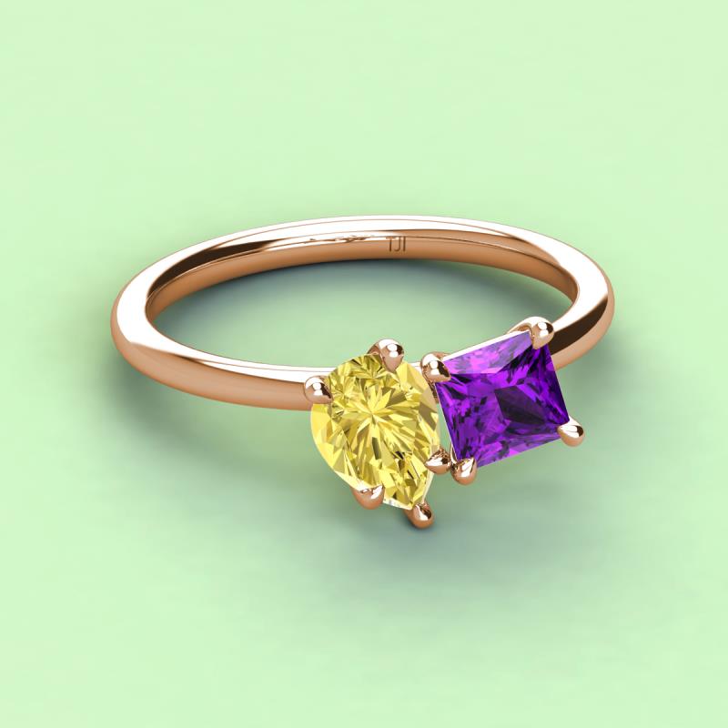 A beautiful symbol of everlasting love, this duo two-stone ring showcases a pair of Pear Shape Yellow Sapphire shimmering alongside of a luminous Princess Shape Amethyst crafted beautifully that represents two of you together.