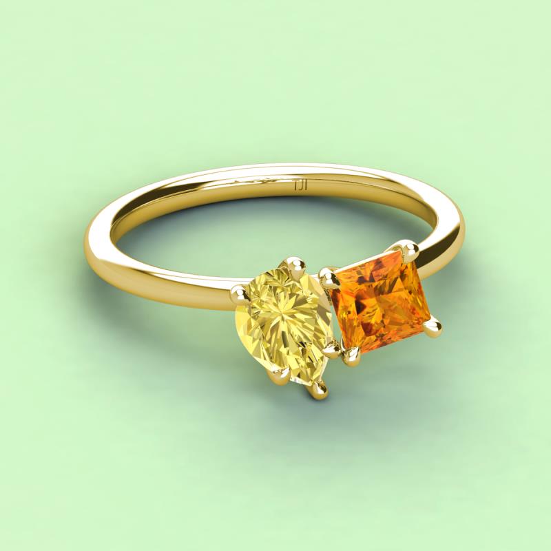 A beautiful symbol of everlasting love, this duo two-stone ring showcases a pair of Pear Shape Yellow Sapphire shimmering alongside of a luminous Princess Shape Citrine crafted beautifully that represents two of you together.