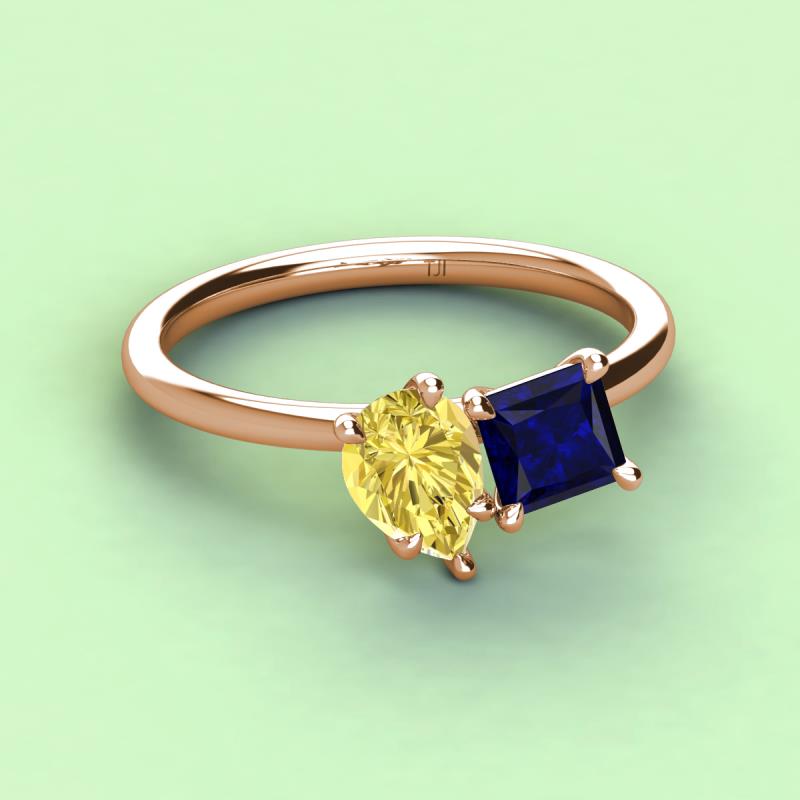 A beautiful symbol of everlasting love, this duo two-stone ring showcases a pair of Pear Shape Yellow Sapphire shimmering alongside of a luminous Princess Shape Lab Created Blue Sapphire crafted beautifully that represents two of you together.