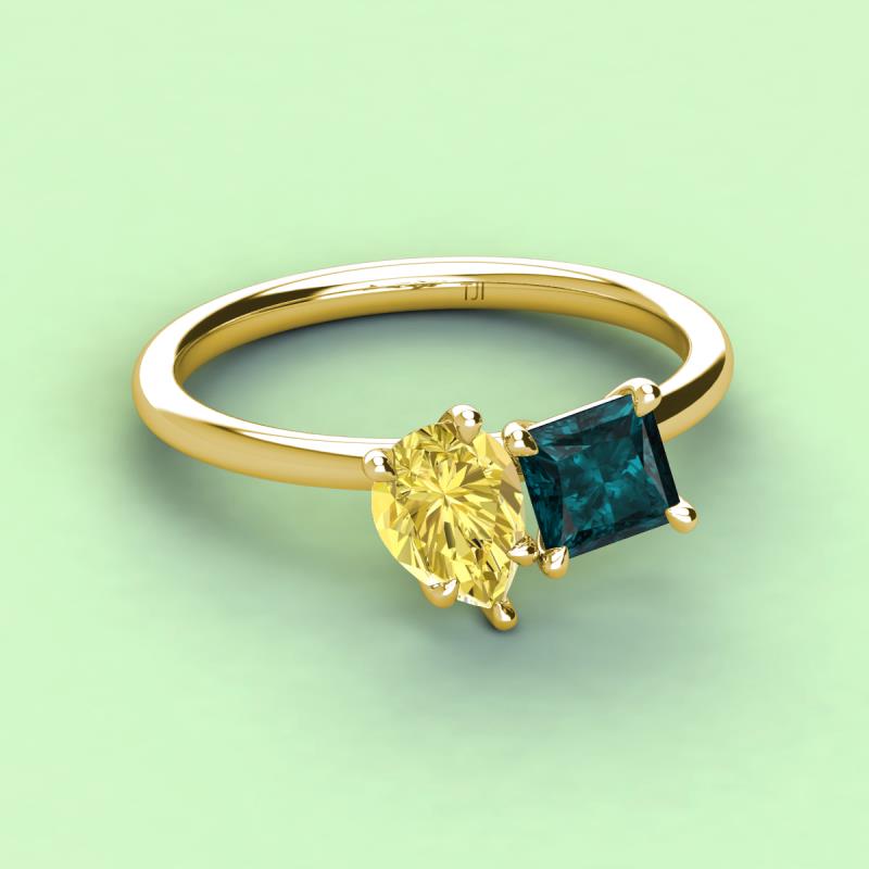 A beautiful symbol of everlasting love, this duo two-stone ring showcases a pair of Pear Shape Yellow Sapphire shimmering alongside of a luminous Princess Shape London Blue Topaz crafted beautifully that represents two of you together.