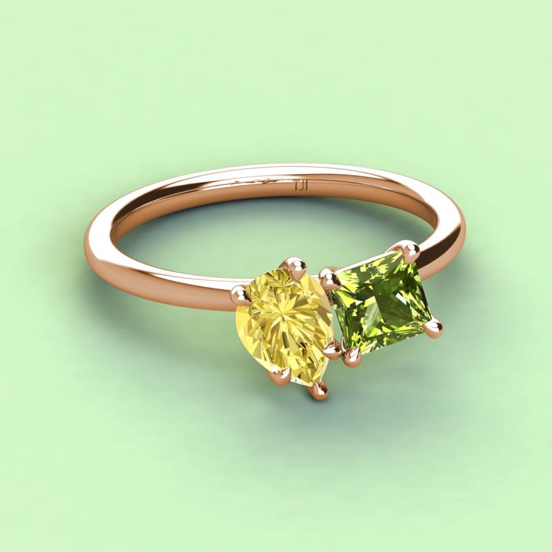 A beautiful symbol of everlasting love, this duo two-stone ring showcases a pair of Pear Shape Yellow Sapphire shimmering alongside of a luminous Princess Shape Peridot crafted beautifully that represents two of you together.