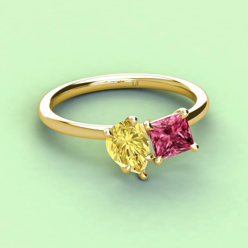 A beautiful symbol of everlasting love, this duo two-stone ring showcases a pair of Pear Shape Yellow Sapphire shimmering alongside of a luminous Princess Shape Pink Tourmaline crafted beautifully that represents two of you together.