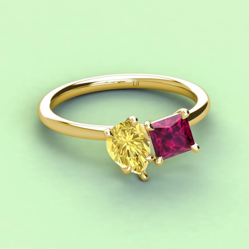 A beautiful symbol of everlasting love, this duo two-stone ring showcases a pair of Pear Shape Yellow Sapphire shimmering alongside of a luminous Princess Shape Rhodolite Garnet crafted beautifully that represents two of you together.