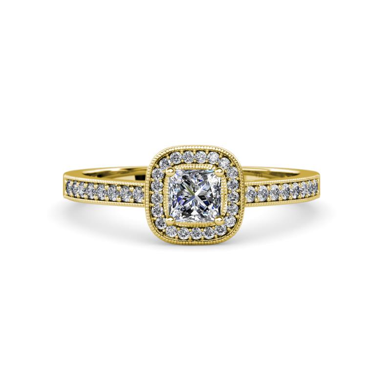 The Dream Prong Set Engagement Ring features a Princess Cut Diamond encircled by a halo of diamonds, giving the appearance of one large, square stone creating a classic style with stunning sparkle.