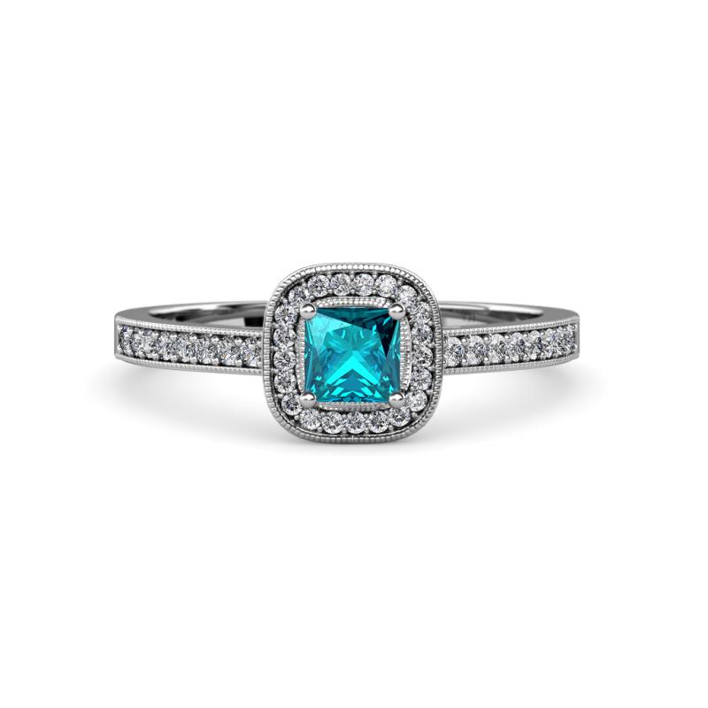 The Dream Prong Set Engagement Ring features a Princess Cut London Blue Topaz encircled by a halo of diamonds, giving the appearance of one large, square stone creating a classic style with stunning sparkle.
