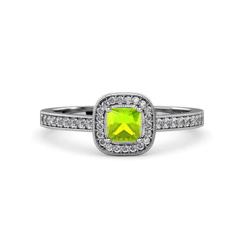 The Dream Prong Set Engagement Ring features a Princess Cut Peridot encircled by a halo of diamonds, giving the appearance of one large, square stone creating a classic style with stunning sparkle.