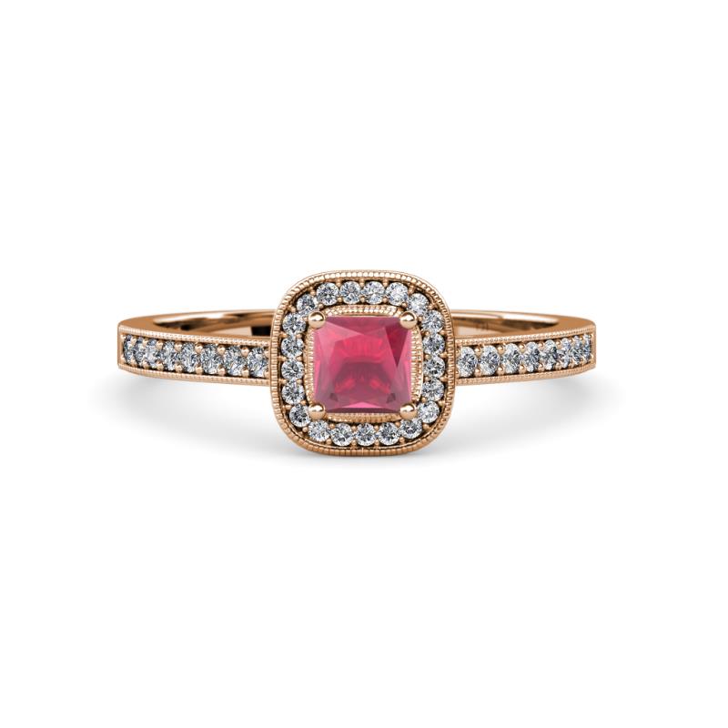 The Dream Prong Set Engagement Ring features a Princess Cut Rhodolite Garnet encircled by a halo of diamonds, giving the appearance of one large, square stone creating a classic style with stunning sparkle.