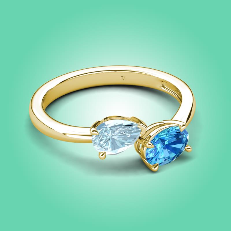 • 1 Aquamarine Pear Shape 0.60 ctw/7x5 mm and 1 Blue Topaz Oval Shape 1.00 ctw/7x5 mm Two Stone Duo Engagement Ring set in a Prong Setting.