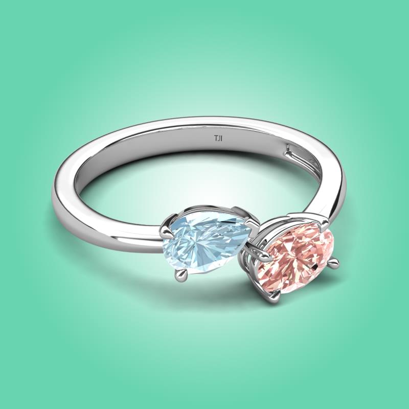 • 1 Aquamarine Pear Shape 0.60 ctw/7x5 mm and 1 Morganite Oval Shape 0.75 ctw/7x5 mm Two Stone Duo Engagement Ring set in a Prong Setting.