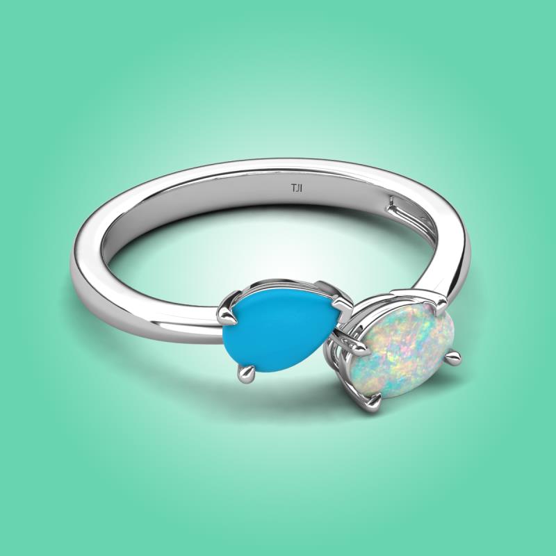 • 1 Blue Sapphire Pear Shape 0.90 ctw/7x5 mm and 1 Opal Oval Shape 0.50 ctw/7x5 mm Two Stone Duo Engagement Ring set in a Prong Setting.
