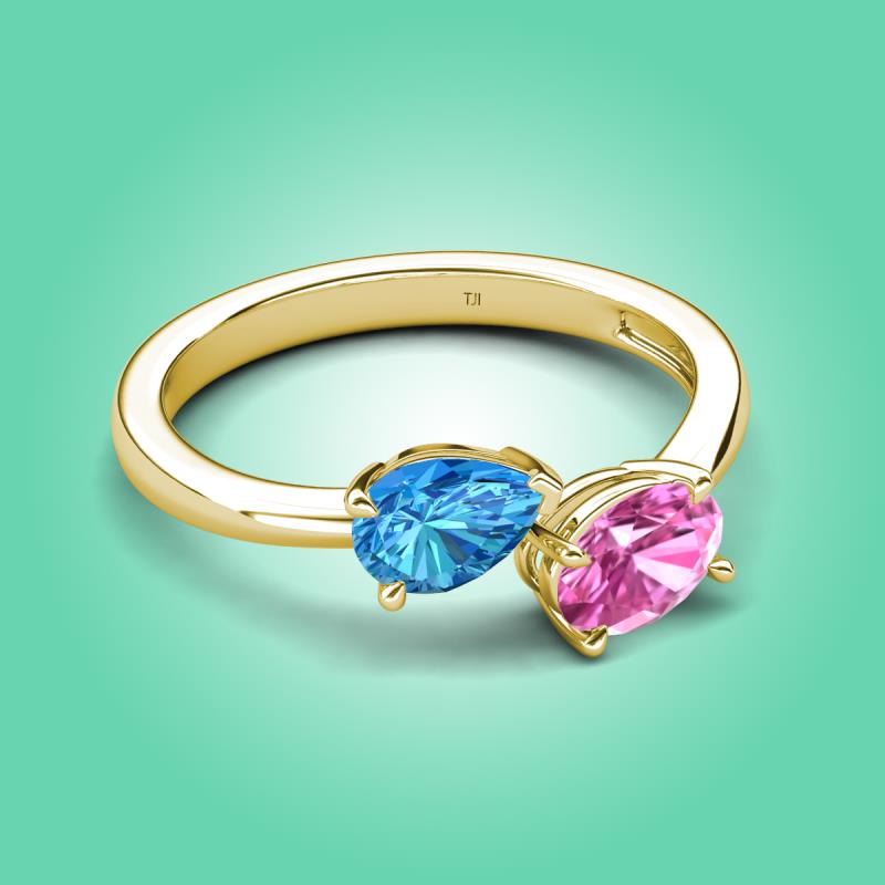 • 1 Blue Topaz Pear Shape 0.85 ctw/7x5 mm and 1 Pink Sapphire Oval Shape 1.00 ctw/7x5 mm Two Stone Duo Engagement Ring set in a Prong Setting.