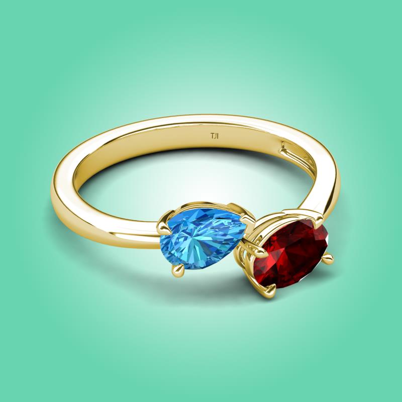 • 1 Blue Topaz Pear Shape 0.85 ctw/7x5 mm and 1 Red Garnet Oval Shape 0.95 ctw/7x5 mm Two Stone Duo Engagement Ring set in a Prong Setting.
