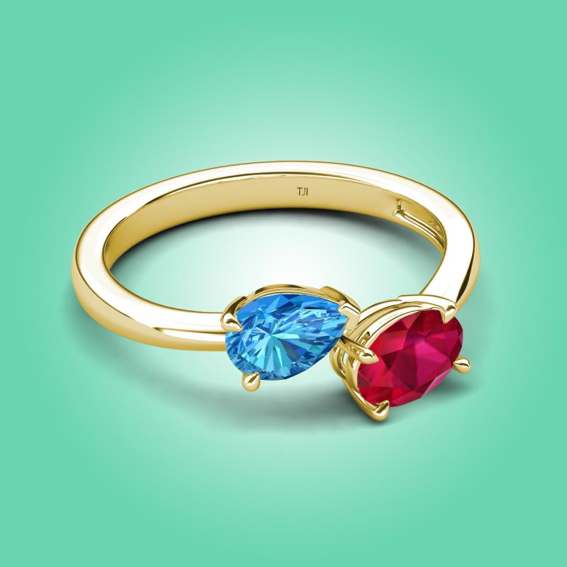 • 1 Blue Topaz Pear Shape 0.85 ctw/7x5 mm and 1 Ruby Oval Shape 0.90 ctw/7x5 mm Two Stone Duo Engagement Ring set in a Prong Setting.