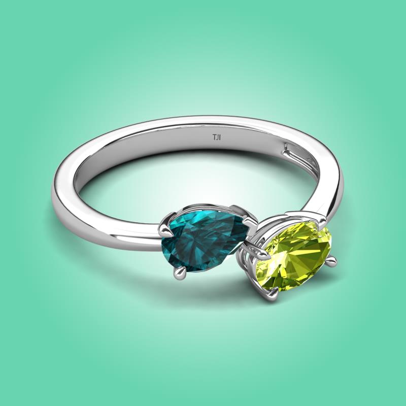 • 1 London Blue Topaz Pear Shape 0.85 ctw/7x5 mm and 1 Peridot Oval Shape 0.90 ctw/7x5 mm Two Stone Duo Engagement Ring set in a Prong Setting.