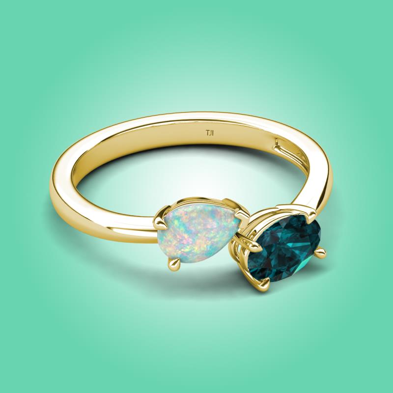 • 1 Opal Pear Shape 0.35 ctw/7x5 mm and 1 London Blue Topaz Oval Shape 1.00 ctw/7x5 mm Two Stone Duo Engagement Ring set in a Prong Setting.