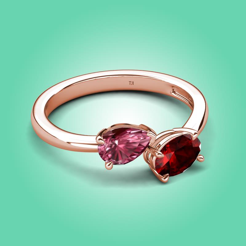 • 1 Pink Tourmaline Pear Shape 0.70 ctw/7x5 mm and 1 Red Garnet Oval Shape 0.95 ctw/7x5 mm Two Stone Duo Engagement Ring set in a Prong Setting.