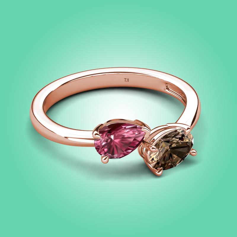 • 1 Pink Tourmaline Pear Shape 0.70 ctw/7x5 mm and 1 Smoky Quartz Oval Shape 0.75 ctw/7x5 mm Two Stone Duo Engagement Ring set in a Prong Setting.