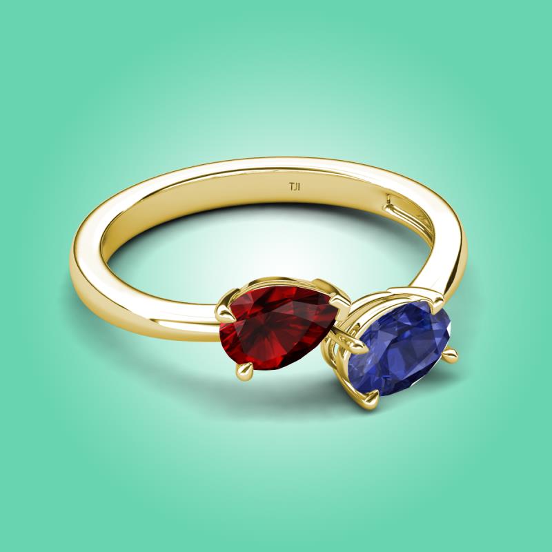 • 1 Red Garnet Pear Shape 0.90 ctw/7x5 mm and 1 Iolite Oval Shape 0.67 ctw/7x5 mm Two Stone Duo Engagement Ring set in a Prong Setting.