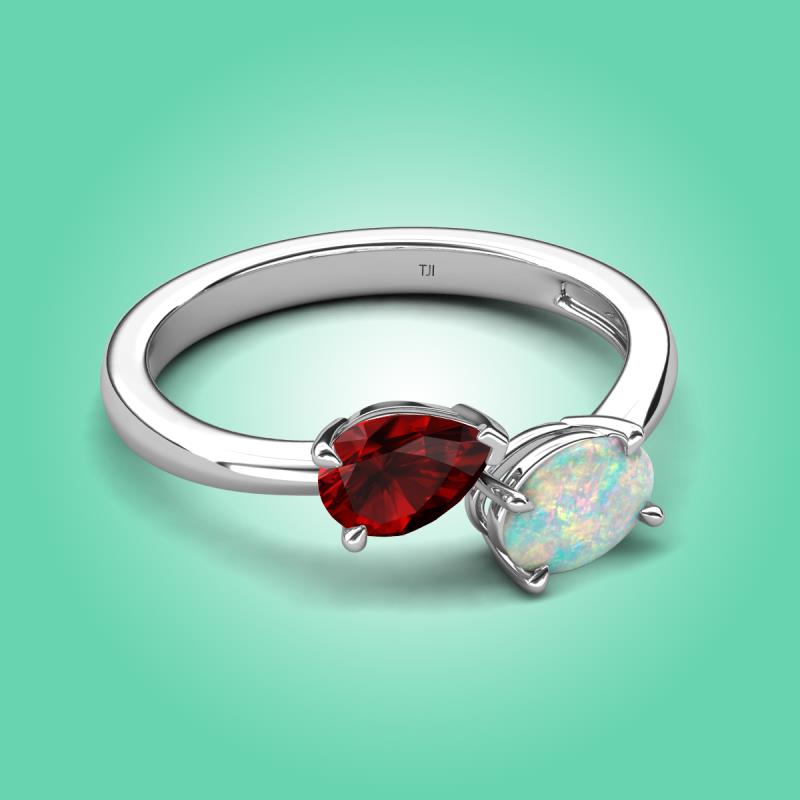 • 1 Red Garnet Pear Shape 0.90 ctw/7x5 mm and 1 Opal Oval Shape 0.50 ctw/7x5 mm Two Stone Duo Engagement Ring set in a Prong Setting.