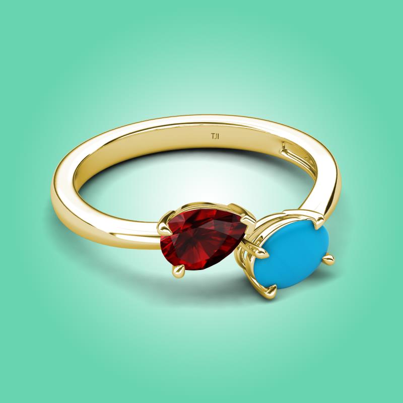 • 1 Red Garnet Pear Shape 0.90 ctw/7x5 mm and 1 Turquoise Oval Shape 0.70 ctw/7x5 mm Two Stone Duo Engagement Ring set in a Prong Setting.