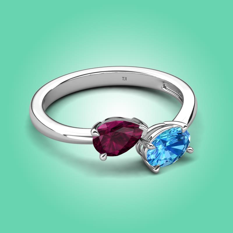 The Rhodolite Garnet Pear Shape and Blue Topaz Oval Shape Toi Et Moi Duo Ring of 1.90 ctw is the perfect representation of your unique and everlasting bond. The pear and oval shaped gemstones set in a Prong setting, complement each other perfectly, creating a stunning and timeless design that will capture the heart of your loved one, symbolizing your eternal love and commitment that will last a lifetime.