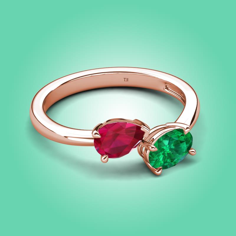 • 1 Ruby Pear Shape 0.95 ctw/7x5 mm and 1 Emerald Oval Shape 0.80 ctw/7x5 mm Two Stone Duo Engagement Ring set in a Prong Setting.