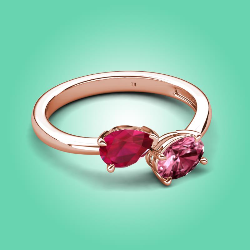 • 1 Ruby Pear Shape 0.95 ctw/7x5 mm and 1 Pink Tourmaline Oval Shape 0.85 ctw/7x5 mm Two Stone Duo Engagement Ring set in a Prong Setting.
