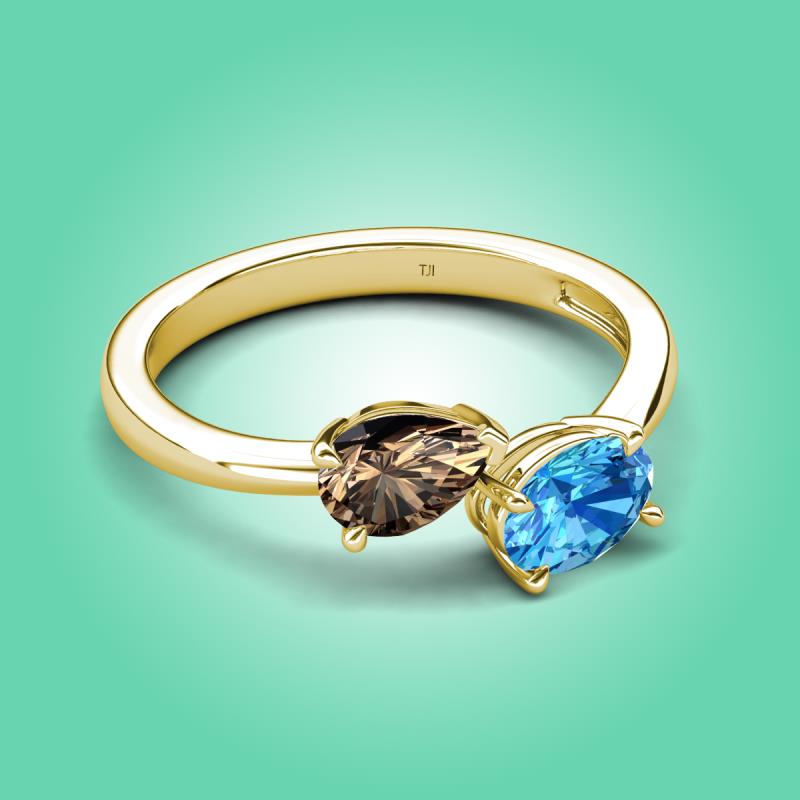 • 1 Smoky Quartz Pear Shape 0.65 ctw/7x5 mm and 1 Blue Topaz Oval Shape 1.00 ctw/7x5 mm Two Stone Duo Engagement Ring set in a Prong Setting.