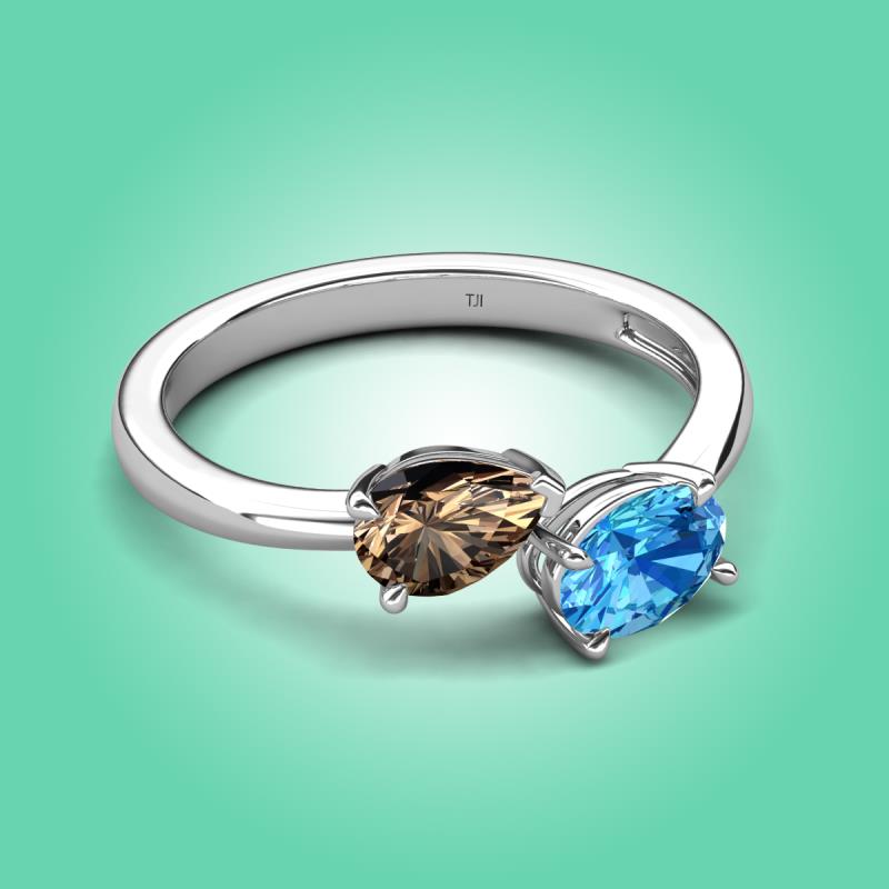 • 1 Smoky Quartz Pear Shape 0.65 ctw/7x5 mm and 1 Blue Topaz Oval Shape 1.00 ctw/7x5 mm Two Stone Duo Engagement Ring set in a Prong Setting.