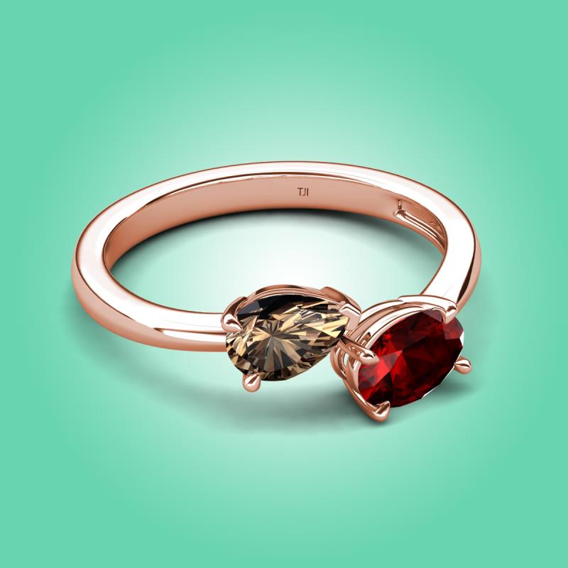 • 1 Smoky Quartz Pear Shape 0.65 ctw/7x5 mm and 1 Red Garnet Oval Shape 0.95 ctw/7x5 mm Two Stone Duo Engagement Ring set in a Prong Setting.