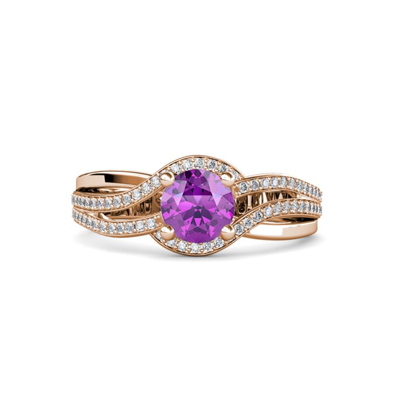 Express your deep love with this gorgeous Engagement Ring with Four Prong set Amethyst wrapped by pave set Diamonds around the bypass halo continuing with alternating crossover shank making it timeless and elegant.