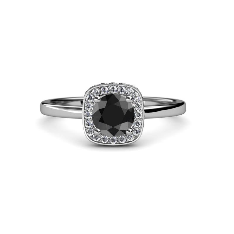This Glorious Engagement Ring holds a Center Round Black Diamond in 4 Prong Setting with a Cushion Shape rollover Halo of Diamonds and plain Bombay Shank is a perfect symbol of heavenly beauty and timeless elegance.