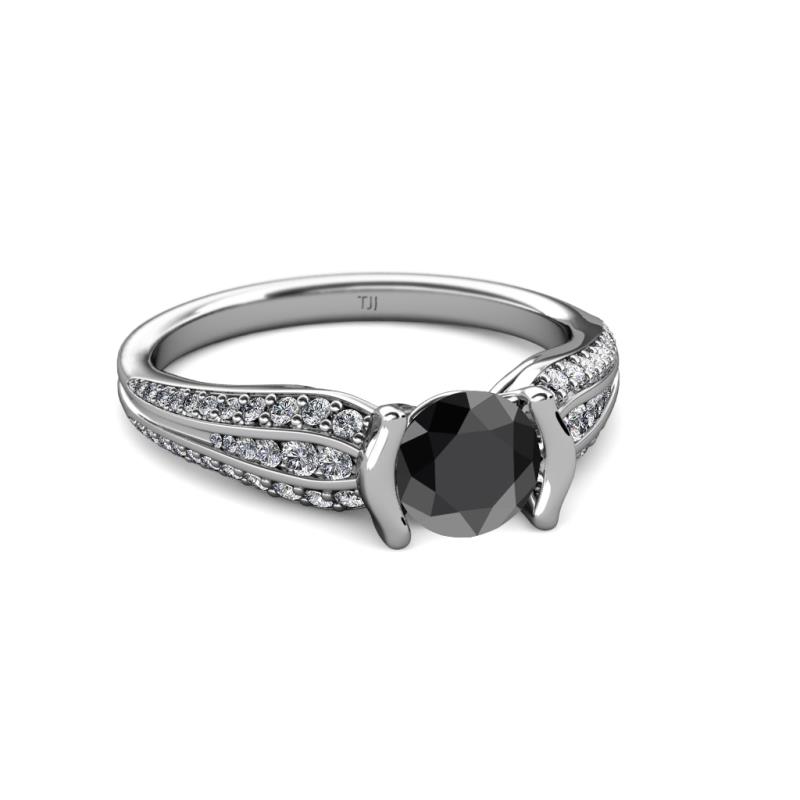 Exude elegance in the adorable beauty of this Engagement Ring with Pave set white Diamond shoulders continuing to three row graduated pave white diamond shank accentuating the stunning Center Black Diamond which is half bezel set securely holding in place making it a perfect balance for a lady on the go.
