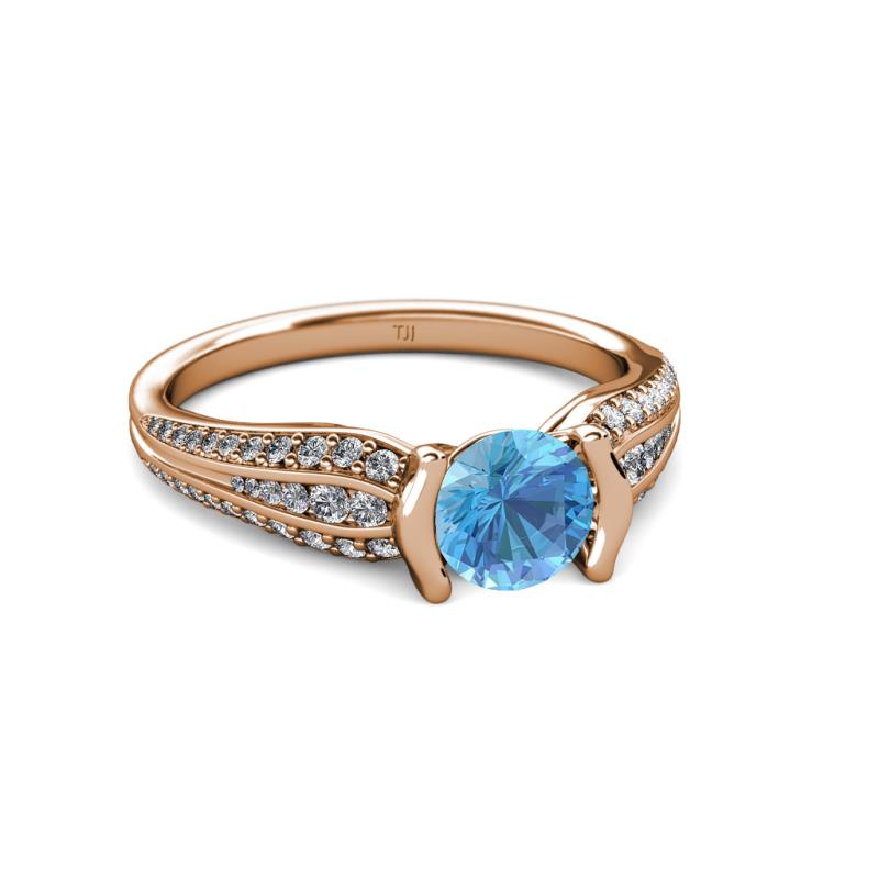 Exude elegance in the adorable beauty of this Engagement Ring with Pave set Diamond shoulders continuing to three row graduated pave diamond shank accentuating the stunning Center Blue Topaz which is half bezel set securely holding in place making it a perfect balance for a lady on the go.