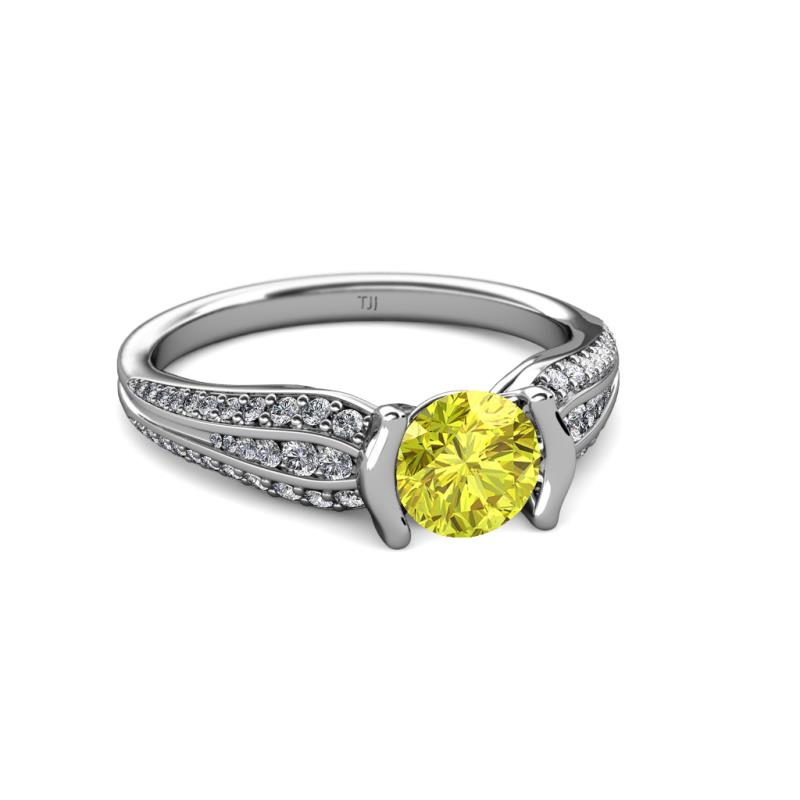 Exude elegance in the adorable beauty of this Engagement Ring with Pave set white Diamond shoulders continuing to three row graduated pave white diamond shank accentuating the stunning Center Yellow Diamond which is half bezel set securely holding in place making it a perfect balance for a lady on the go.