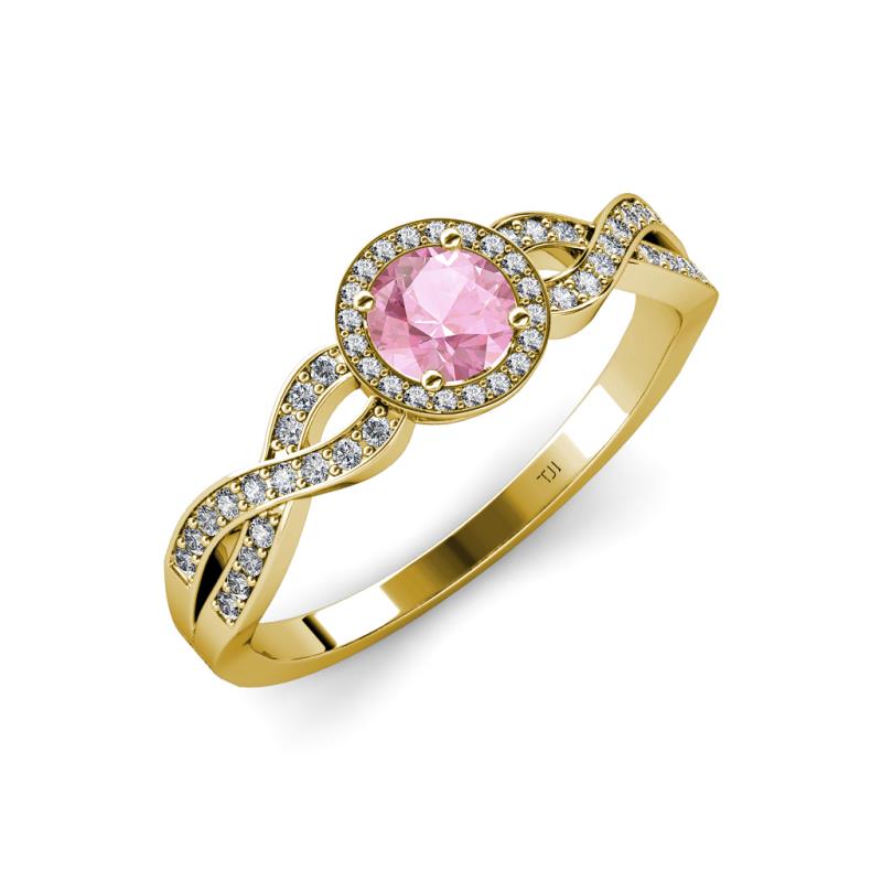 Show your style with this stunning 0.96 ct tw Engagement Ring which features a Center Pink Tourmaline wrapped with a frame of glittering Halo Diamond along with swirl diamond-lined shank completing the look.