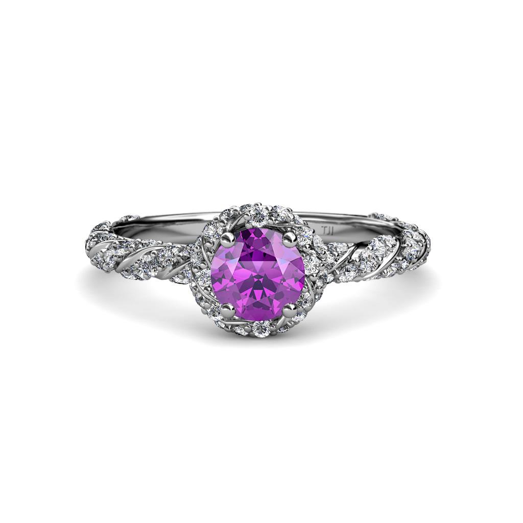 Express Your love and ask her to be yours forever with this exquisite Halo Engagement Ring featuring Center Amethyst in a 4 Prong Setting with Halo of single row Pave Set Diamonds overlapping by swirl rope single row Pave Shank.
