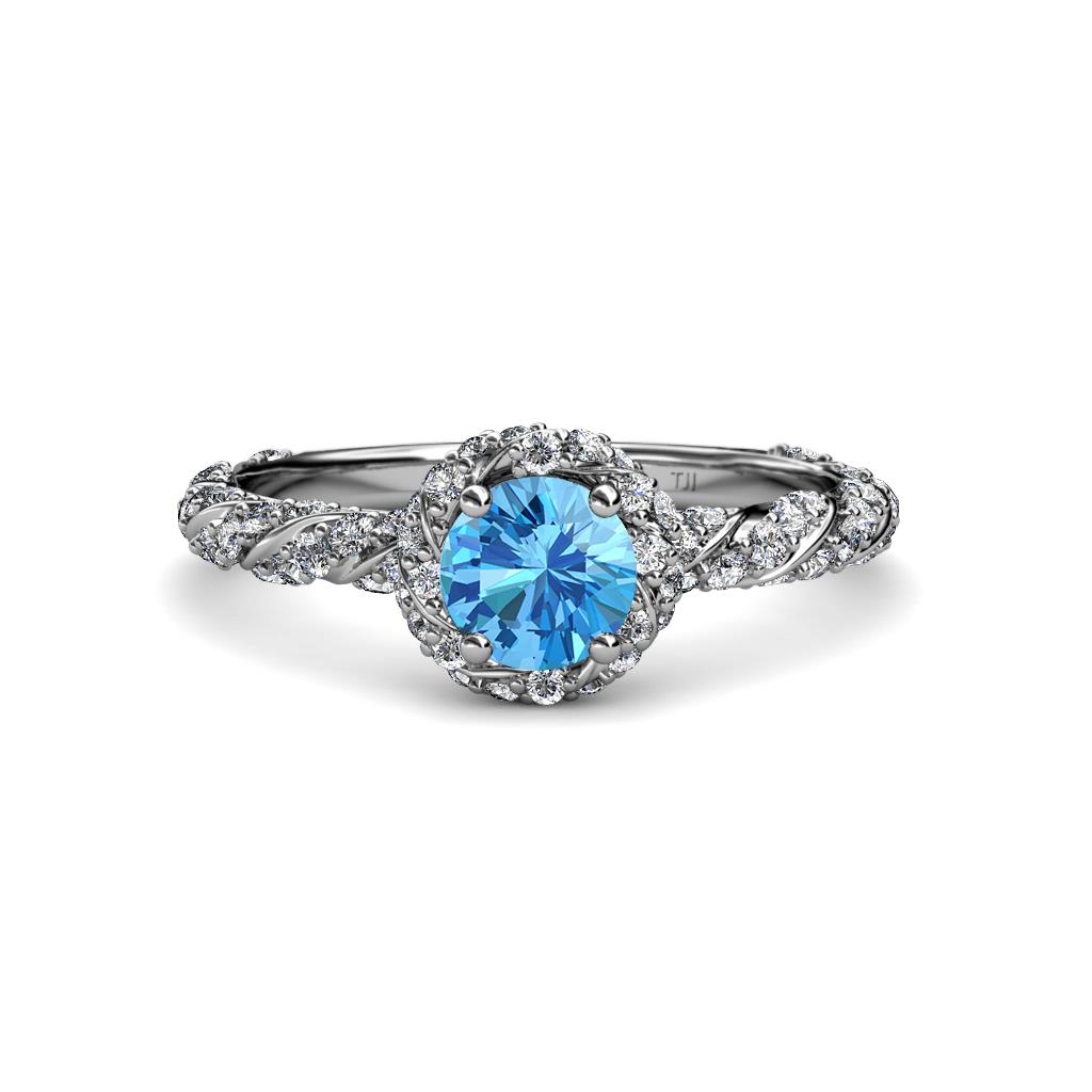 Express Your love and ask her to be yours forever with this exquisite Halo Engagement Ring featuring Center Blue Topaz in a 4 Prong Setting with Halo of single row Pave Set Diamonds overlapping by swirl rope single row Pave Shank.