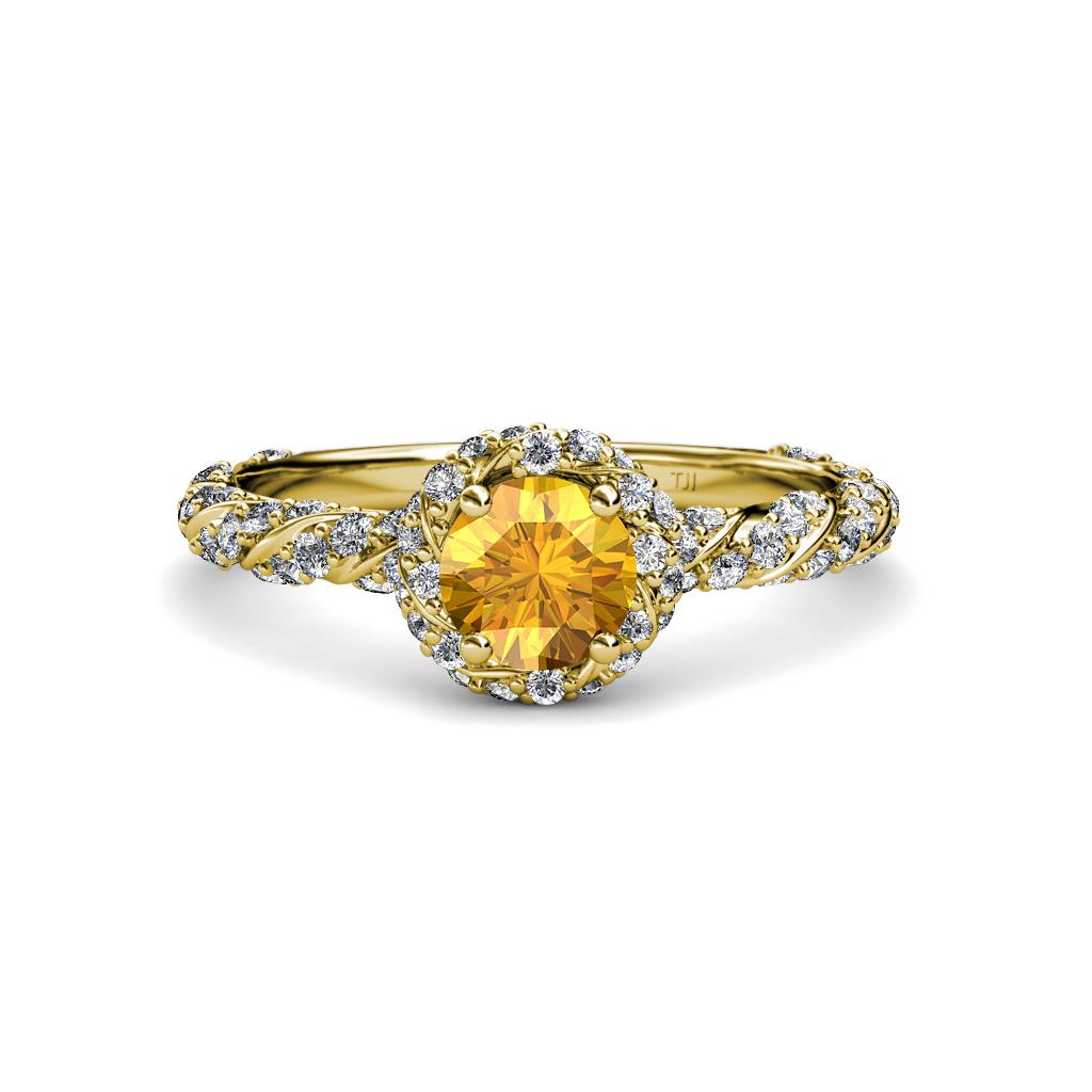 Express Your love and ask her to be yours forever with this exquisite Halo Engagement Ring featuring Center Citrine in a 4 Prong Setting with Halo of single row Pave Set Diamonds overlapping by swirl rope single row Pave Shank.