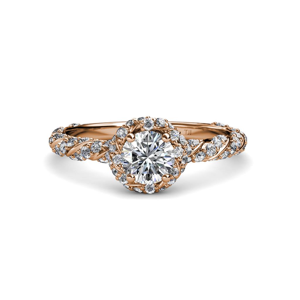 Express Your love and ask her to be yours forever with this exquisite Halo Engagement Ring featuring Center Diamond in a 4 Prong Setting with Halo of single row Pave Set Diamonds overlapping by swirl rope single row Pave Shank.