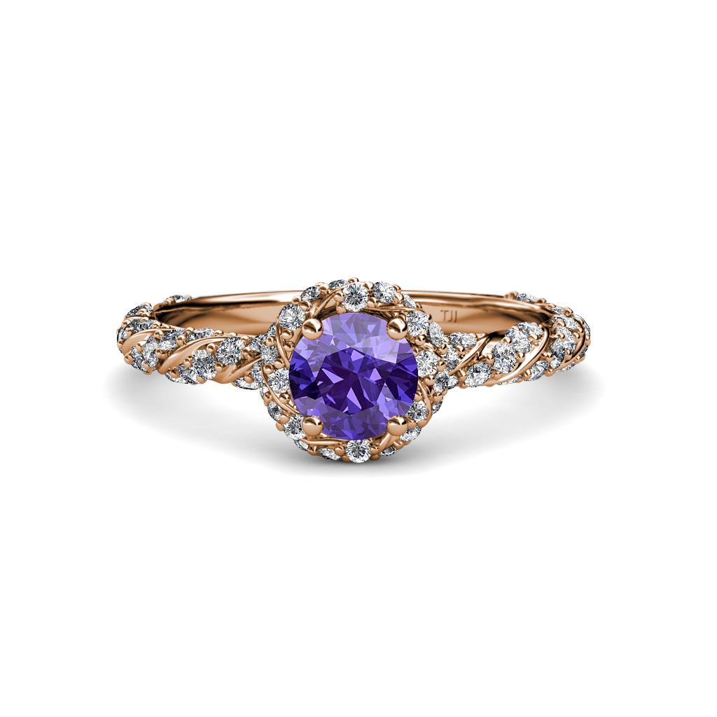 Express Your love and ask her to be yours forever with this exquisite Halo Engagement Ring featuring Center Iolite in a 4 Prong Setting with Halo of single row Pave Set Diamonds overlapping by swirl rope single row Pave Shank.