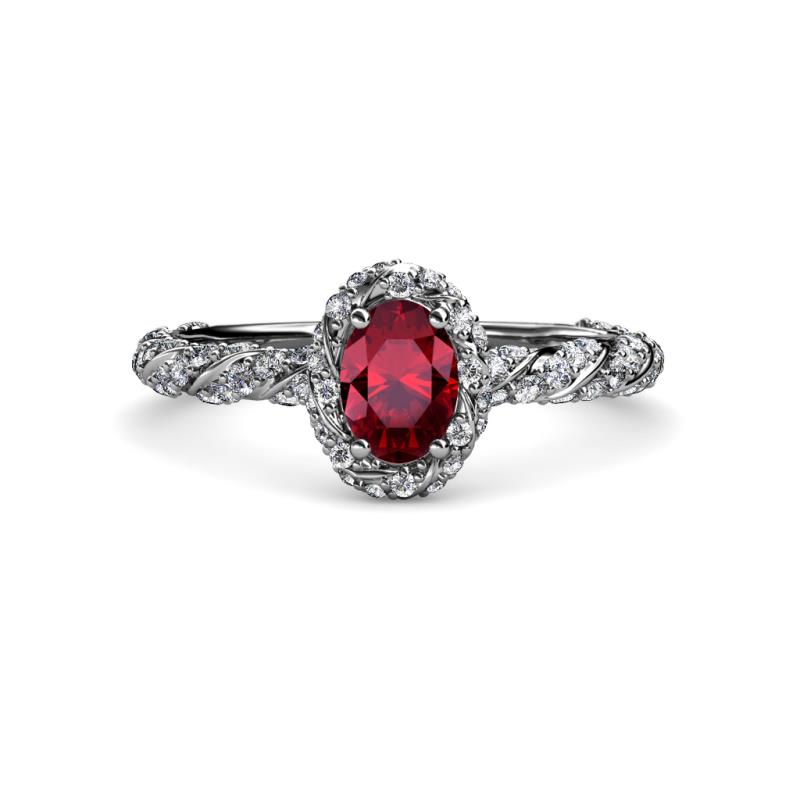 Express Your love and ask her to be yours forever with this exquisite Halo Engagement Ring featuring Center Oval Shape Ruby in a 4 Prong Setting with Halo of single row Pave Set Diamonds overlapping by swirl rope single row Pave Shank.
